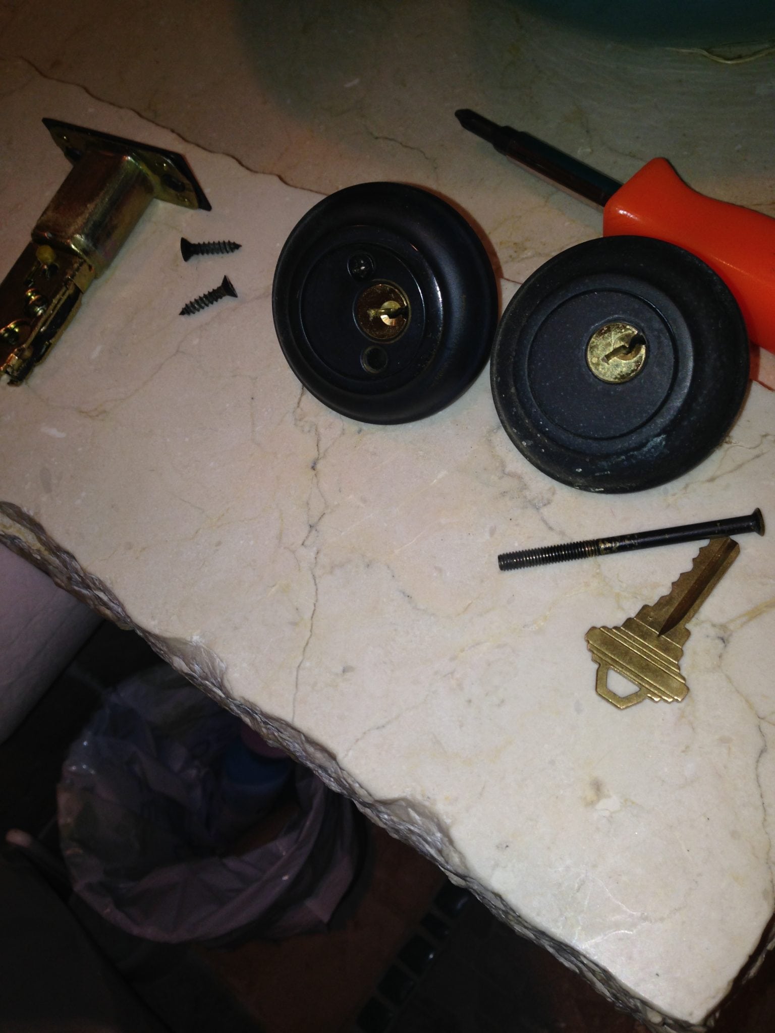 A regular client from Long Island in Roslyn heights wanted a locksmith who could install new locks including a signal side deadlock. On arrival, we examined the doors and the existing schlage locks and mapped out strategies to help us install the single side deadbolt baldwin lock. The new lock had a template which we used as a guide to make holes where the deadbolts lock could fit. We had a number of tools to use ranging from a wood chisel, a spade plate, head screw driver and a razor blade.